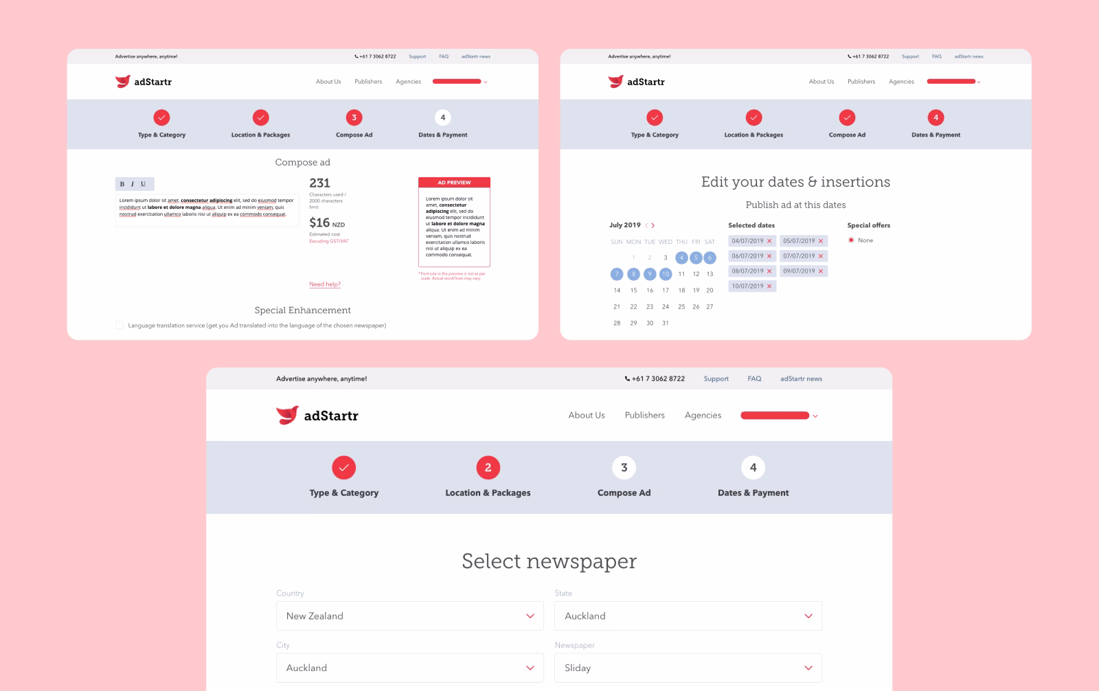 A multi-step flow guides users from ad selection through packages, scheduling, and final payment.