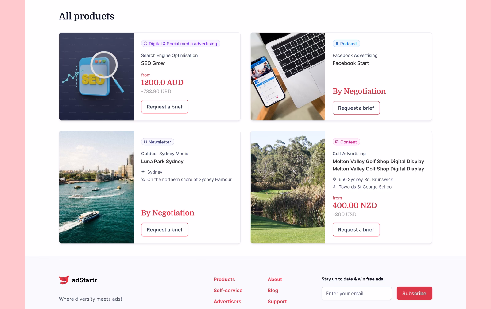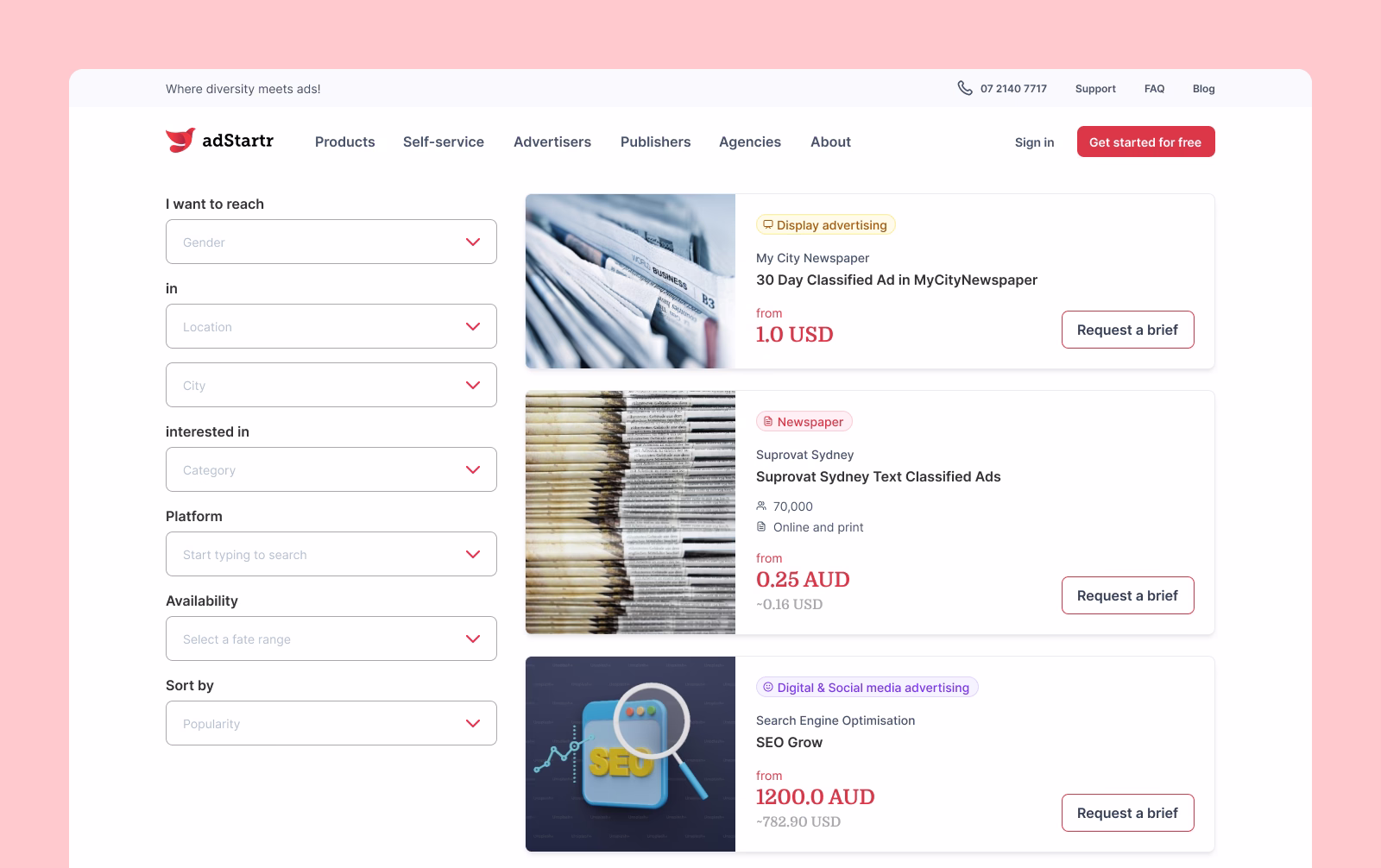 A global media marketplace connecting advertisers with publishers to book advertising across print, outdoor, and radio channels. The platform enables users to browse inventory, compare packages, and manage campaigns with integrated payments, geo-based search, and multi-region support, simplifying media buying worldwide.