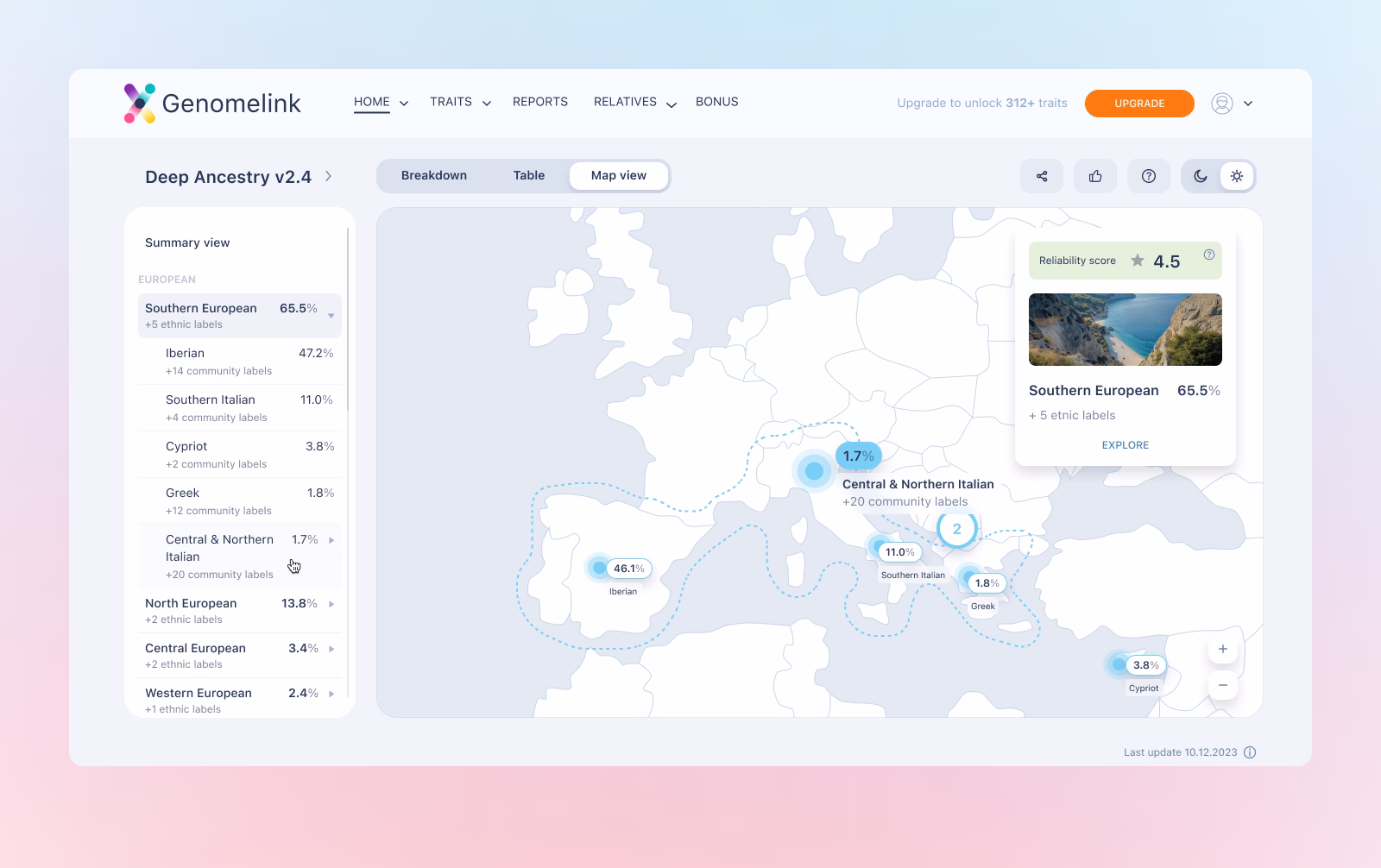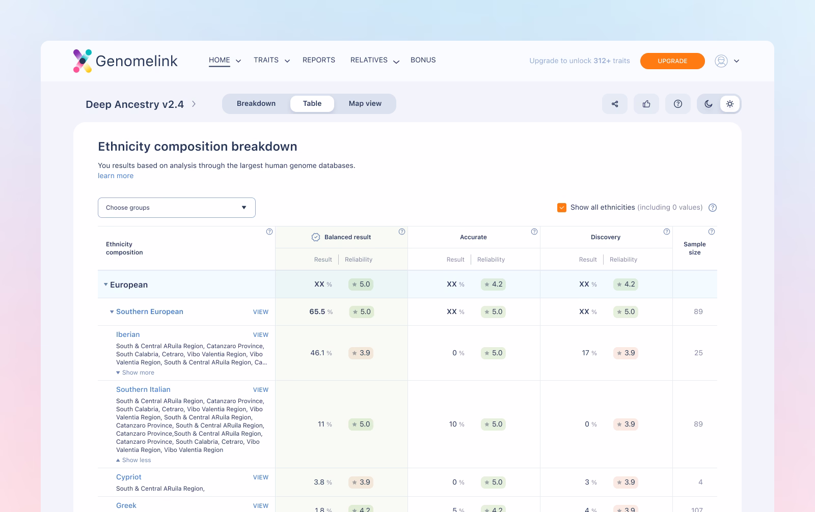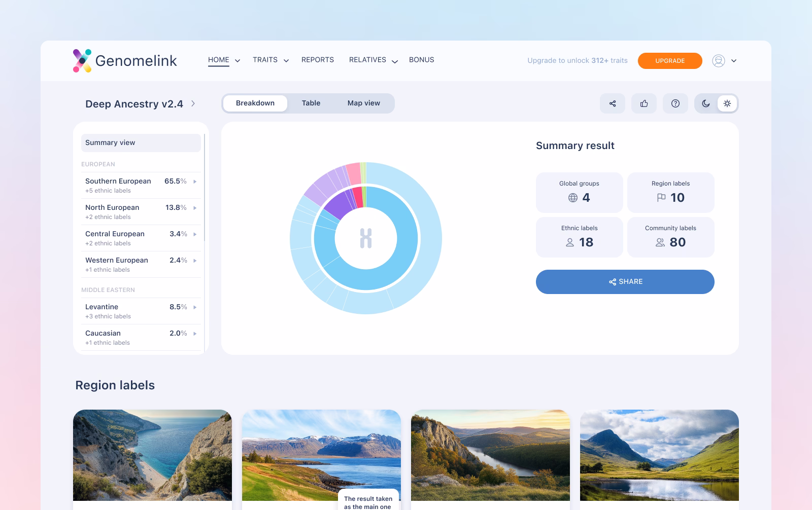 Analyses over 130 ethnicities, sub-regions, and 1,800+ communities, visually organizing complex ancestry data into a detailed, nuanced, and easily interpretable overview for users.