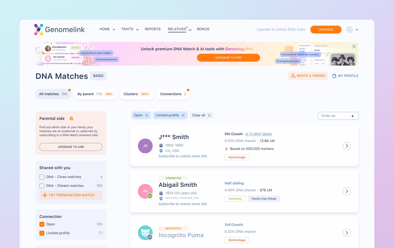 DNA Match is a Genomelink feature designed to help users discover their genetic relatives across all major DNA testing services. By uploading raw DNA data, users can compare shared segments, explore detailed match profiles and communicate through built-in chat—turning ancestry exploration into personal discovery and a genuine human connection.