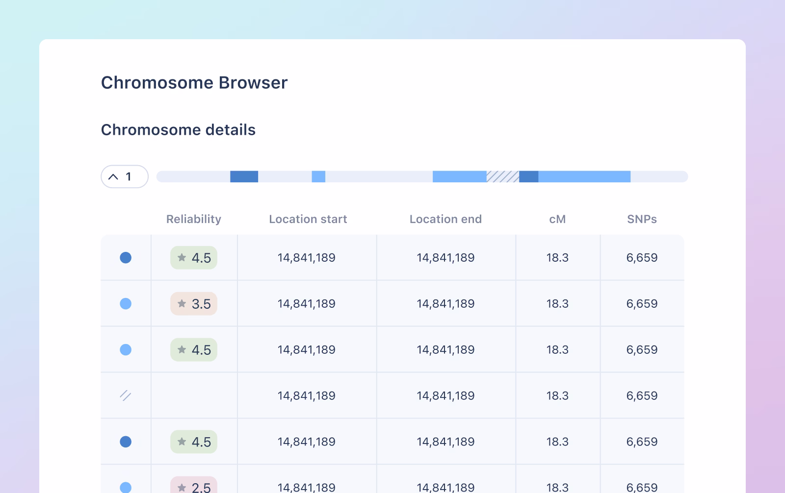 Custom-trained models evaluate ancestry across each chromosome, offering confidence scores, local ancestry segments, and precise insight into the genetic paths that connect users to their relatives.