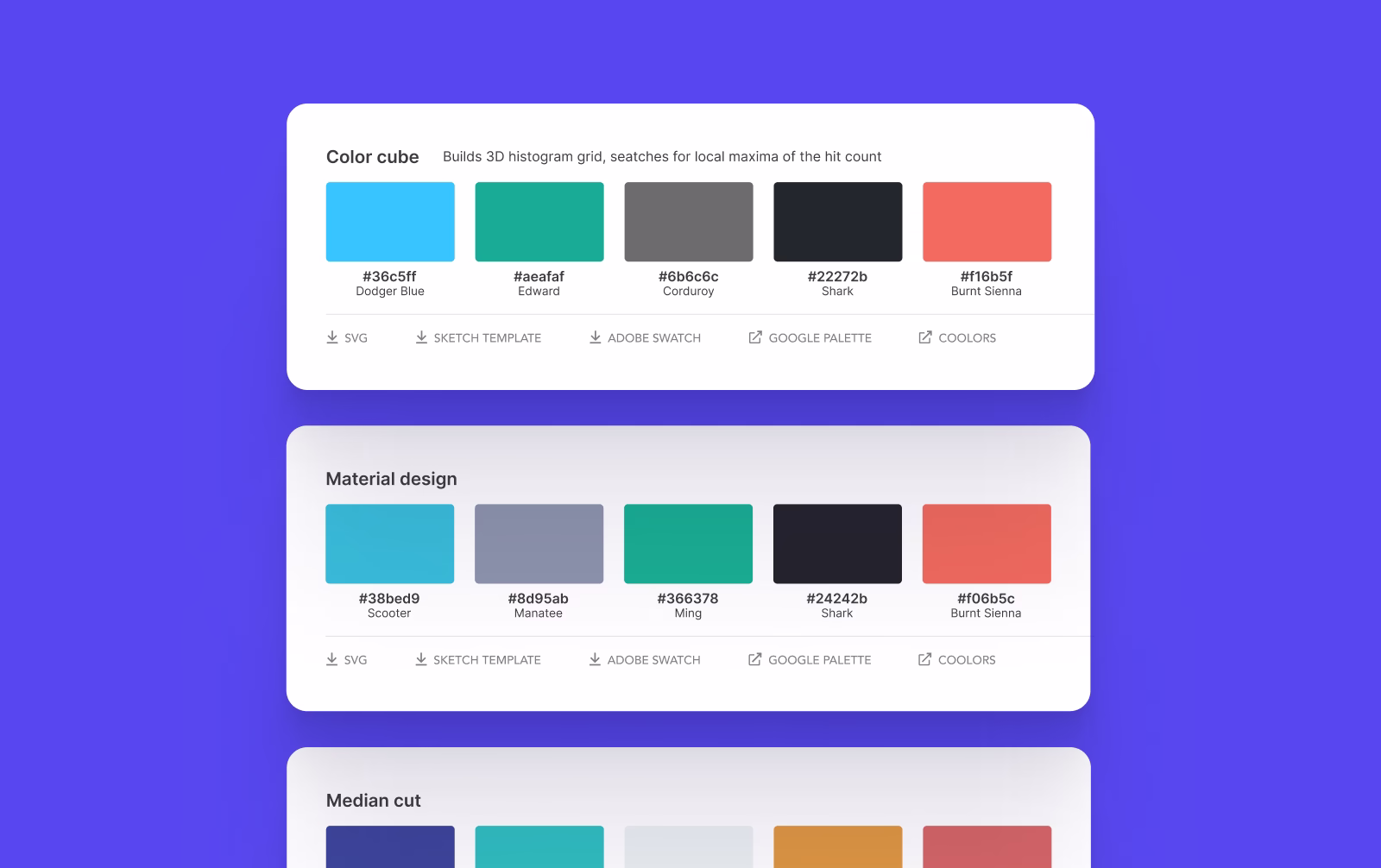 Palettes can be exported to Sketch, Adobe Swatch, SVG, and external color tools, allowing designers to move seamlessly from inspiration to production without disrupting existing workflows.