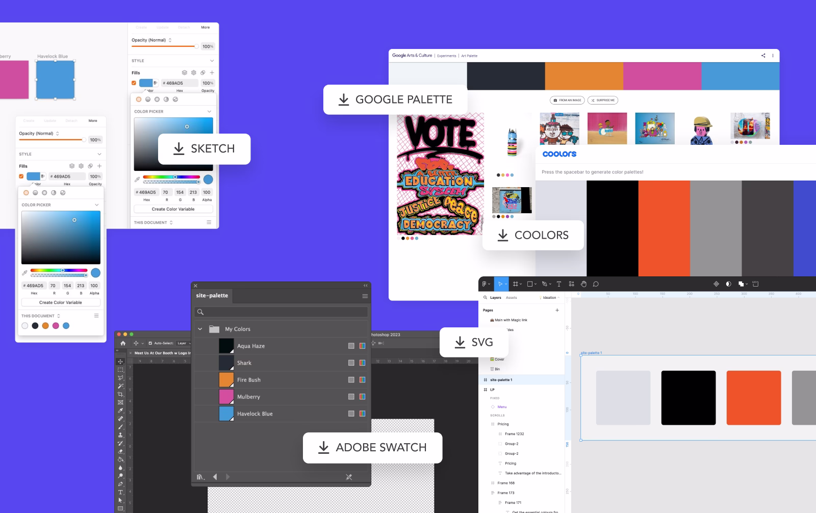 Palettes work seamlessly with Sketch, Adobe Swatch, SVG, and popular color tools.