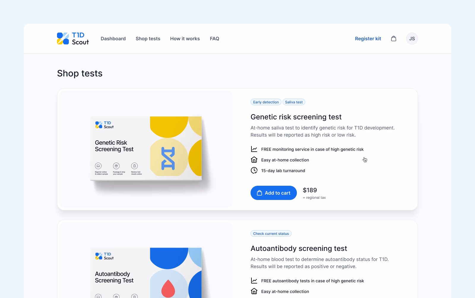 The platform presents the product, allows users to purchase the test kit, and provides access to a user portal where participants can register and manage their testing process.