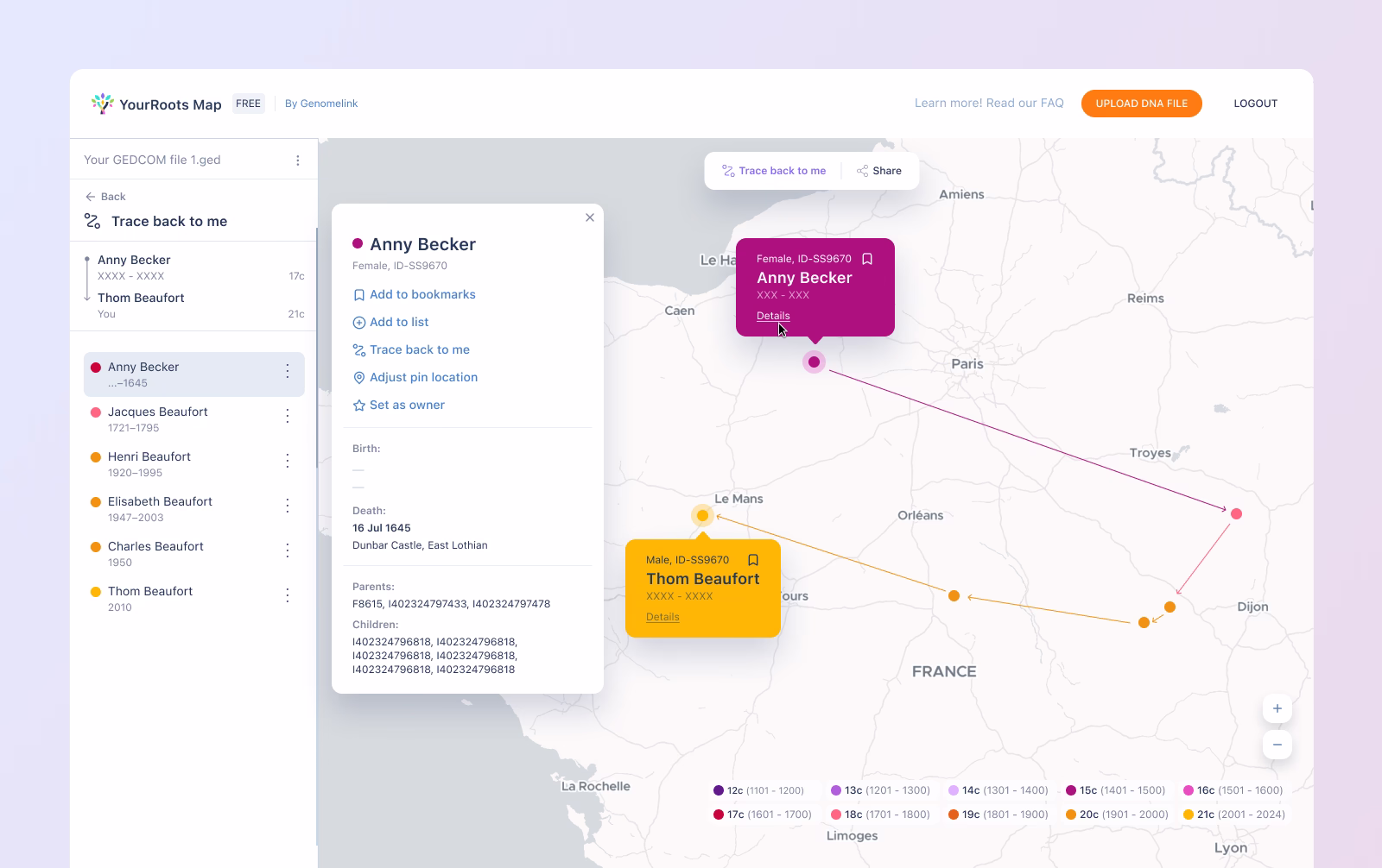 YourRoots Map brings your family history to life as an interactive global journey. Import your GEDCOM to explore roots across the world, uncover migration stories, trace each ancestor’s path to you, visualize generations on a vibrant map, and share your family’s story in a way that’s as engaging as it is enlightening.