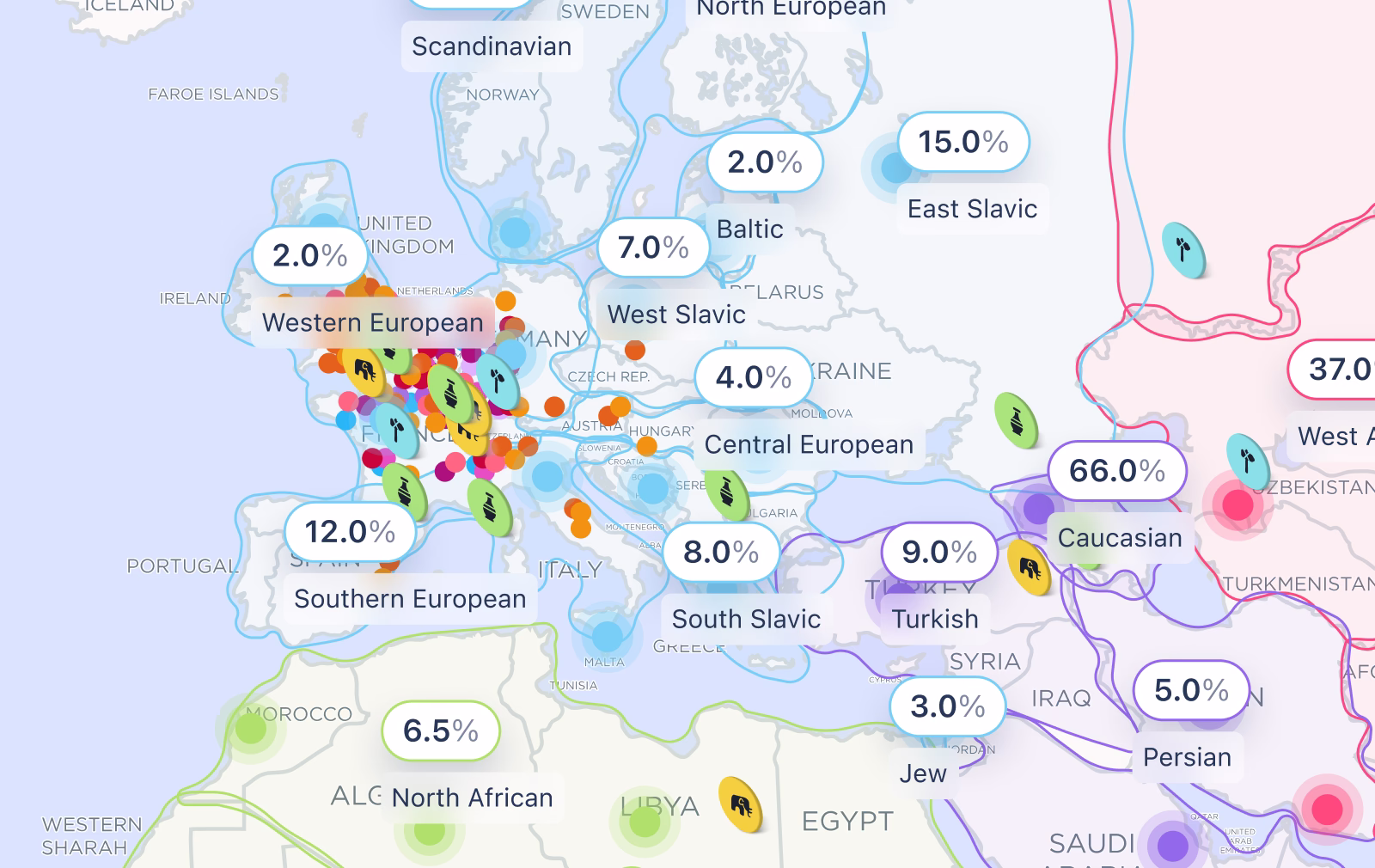 A layered map combining DNA origins, ancient samples, and migration paths in one view.